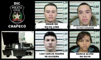 A Polícia Civil, através da Divisão de Investigação Criminal (DIC) de Chapecó, desarticulou na última terça-feira (26) uma quadrilha responsável por diversos assaltos que vinham sendo cometidos na cidade. Durante a ação, foram presos Luiz Carlos Soares de Oliveira, 28 anos, Odair da Silva Lima, 23 anos, Patrick Manoel Modesto da Cruz Schneider, 22 anos, e Márcia Alves de Silva, 19 anos. Todos autuados por furto, receptação e formação de quadrilha.