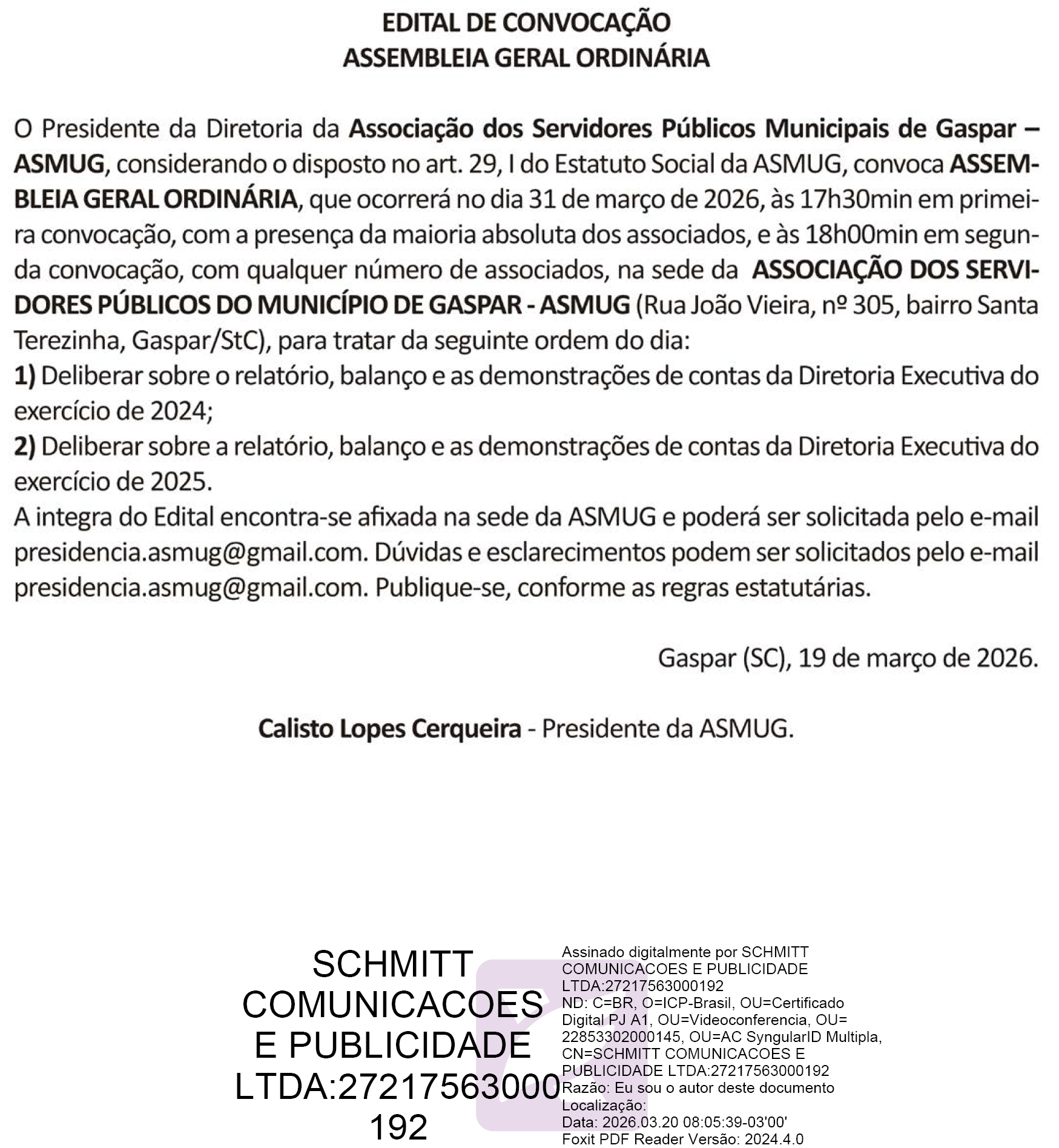 Edital de Convocação - Assembleia Geral Ordinária ASMUG - Jornal Cruzeiro do Vale