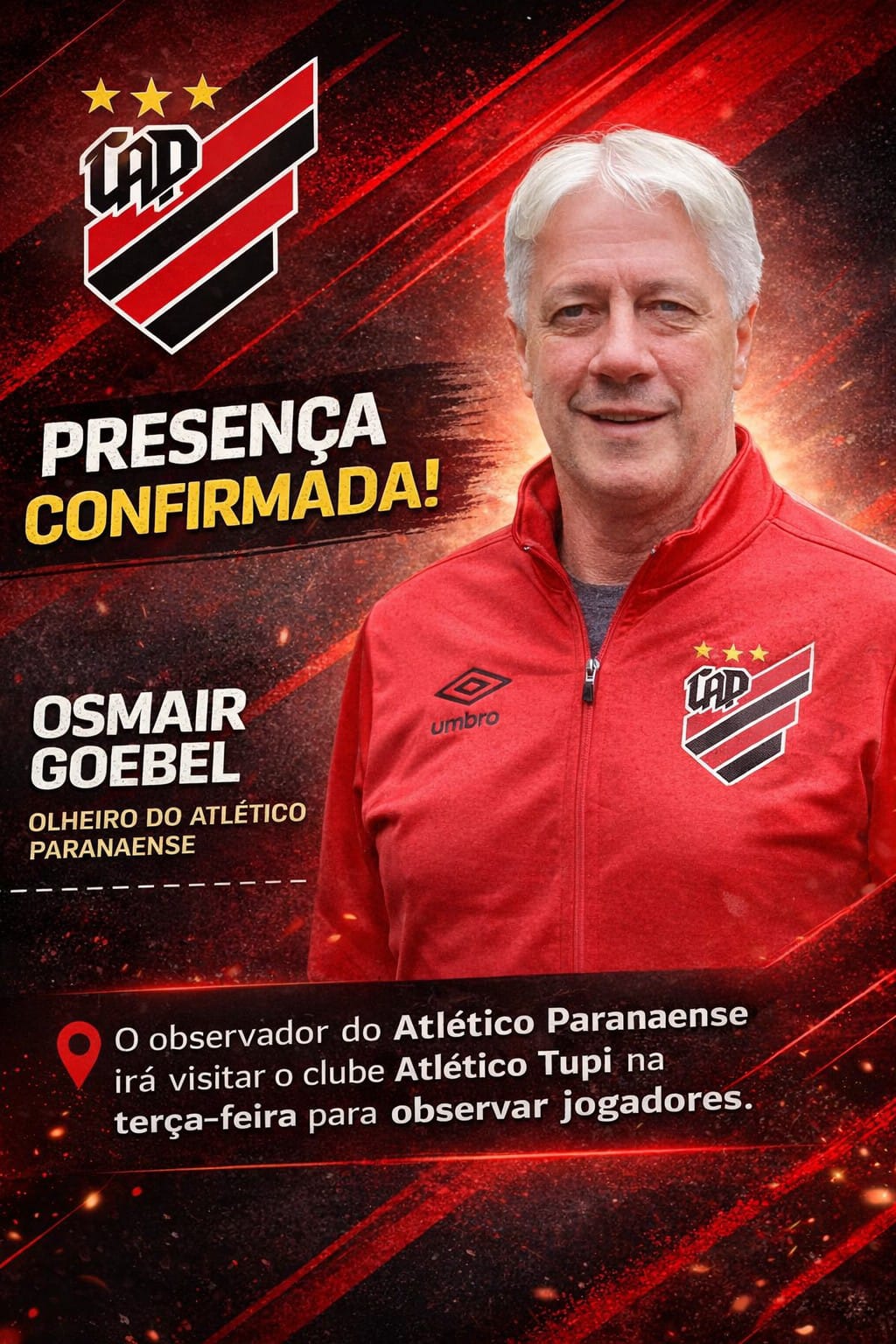 Osmair Goebel foi campeão catarinense pelo Criciúma em 1986 e teve passagens marcantes pelo Athlético Paranense, BEC de Blumenau e Gaziantepspor da Turquia. Ele será o responsável por observar o desempenho dos atletas que treinam no Tupi.