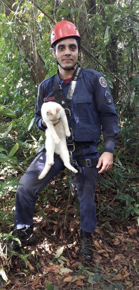 Foram realizadas as técnicas de salvamento em altura e o gato foi resgatado sem ferimentos. Ele foi entregue ao proprietário.
