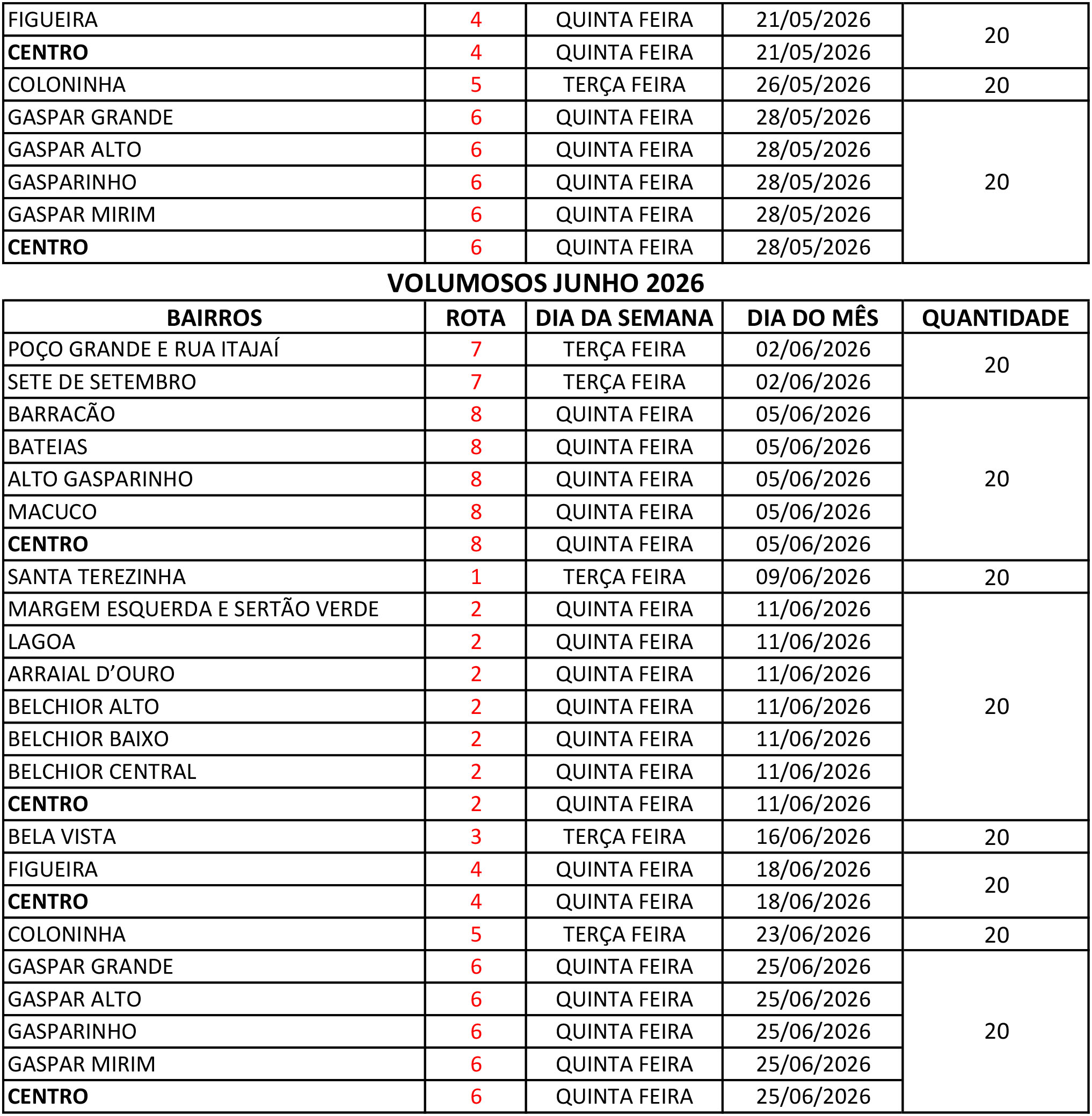 Esta coleta é destinada a materiais de grande porte que o caminhão convencional não transporta, coo móveis, sofás e colchões. Para ter acesso ao serviço, basta agendar pelo WhatsApp (47) 99286-6268. A recomendação é de que os volumosos sejam colocados em frente às casas apenas no dia da coleta.