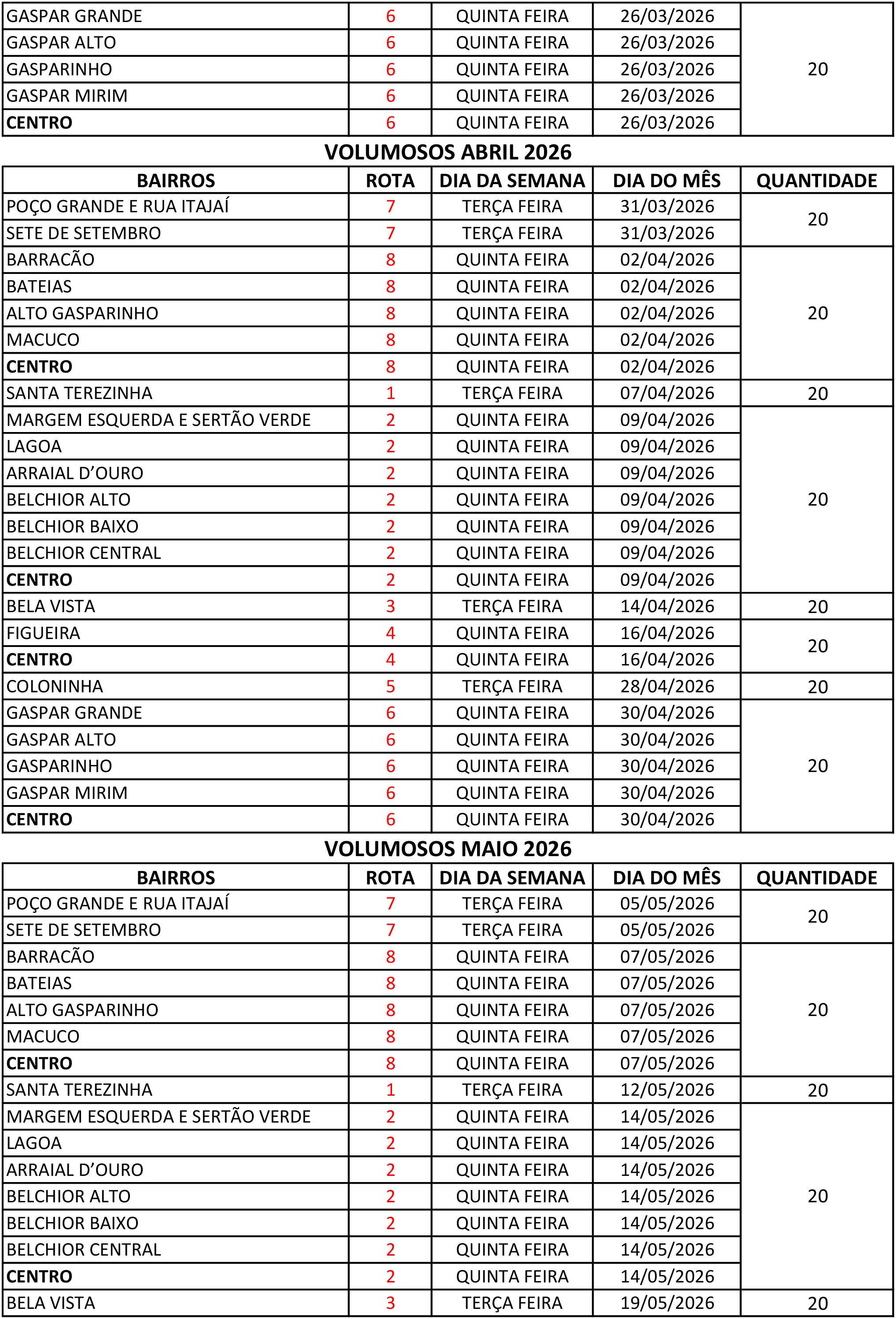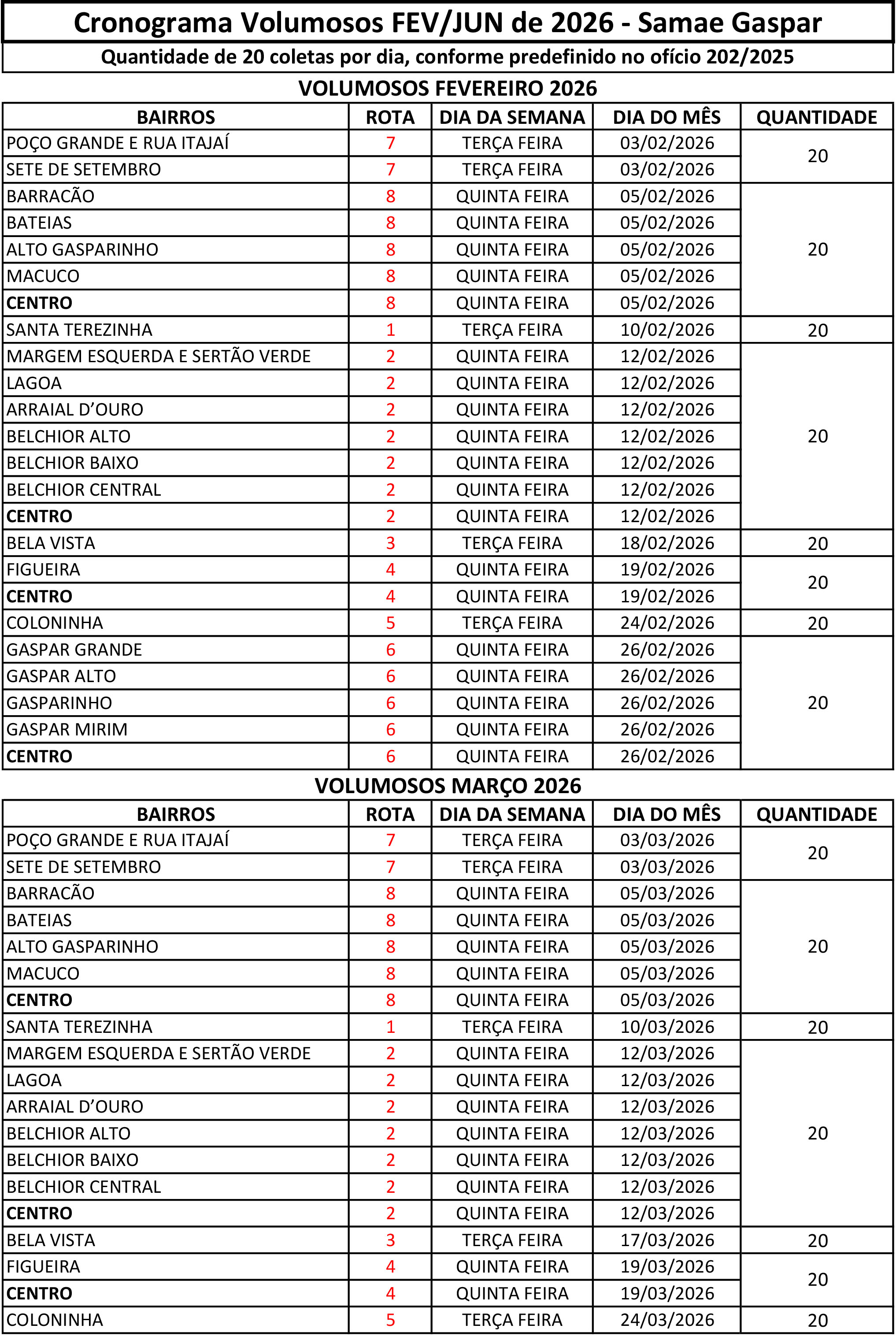 Fevereiro começou e, com o novo mês, o Samae retoma a coleta de volumosos em Gaspar. A coleta ocorre toda terça e quinta-feira. O primeiro roteiro inclui os bairros Poço Grande e Sete de Setembro e a expectativa é de que até a metade do ano o caminhão tenha percorrido todos os bairros da cidade.