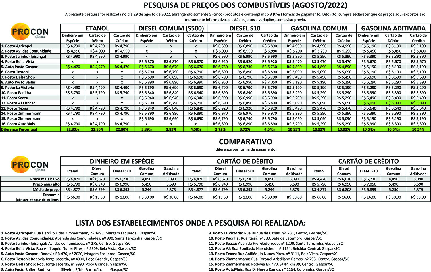 A pesquisa que compara o preço dos combustíveis em Gaspar é realizada mensalmente pelo Procon. Ela tem caráter informativo e visa mostrar ao consumidor como é importante pesquisar antes de comprar.