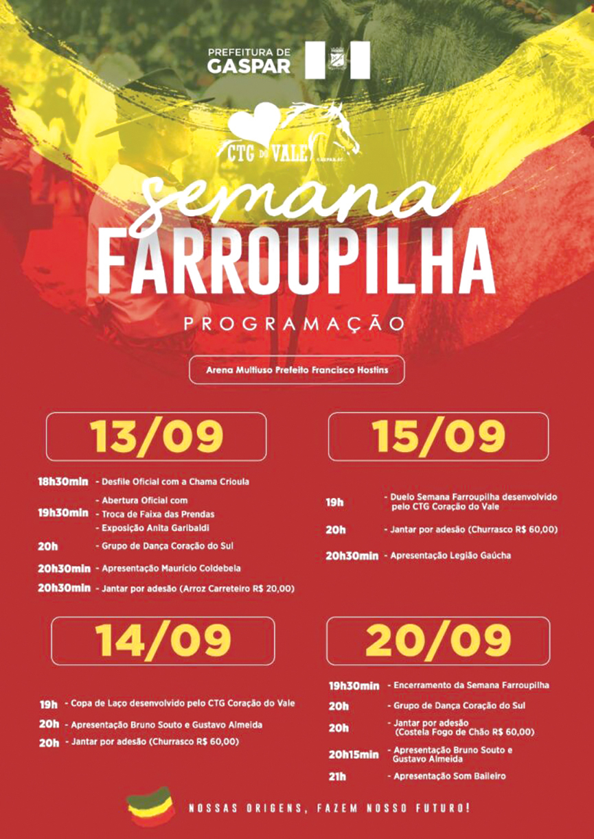 Setembro é um mês especial para quem aprecia a cultura gaúcha. Em Gaspar, a Semana Farroupilha será comemorada de 13 a 20. A chegada da ‘Chama Crioula’ marca o início das atividades, que acontecem durante sete dias de festas.