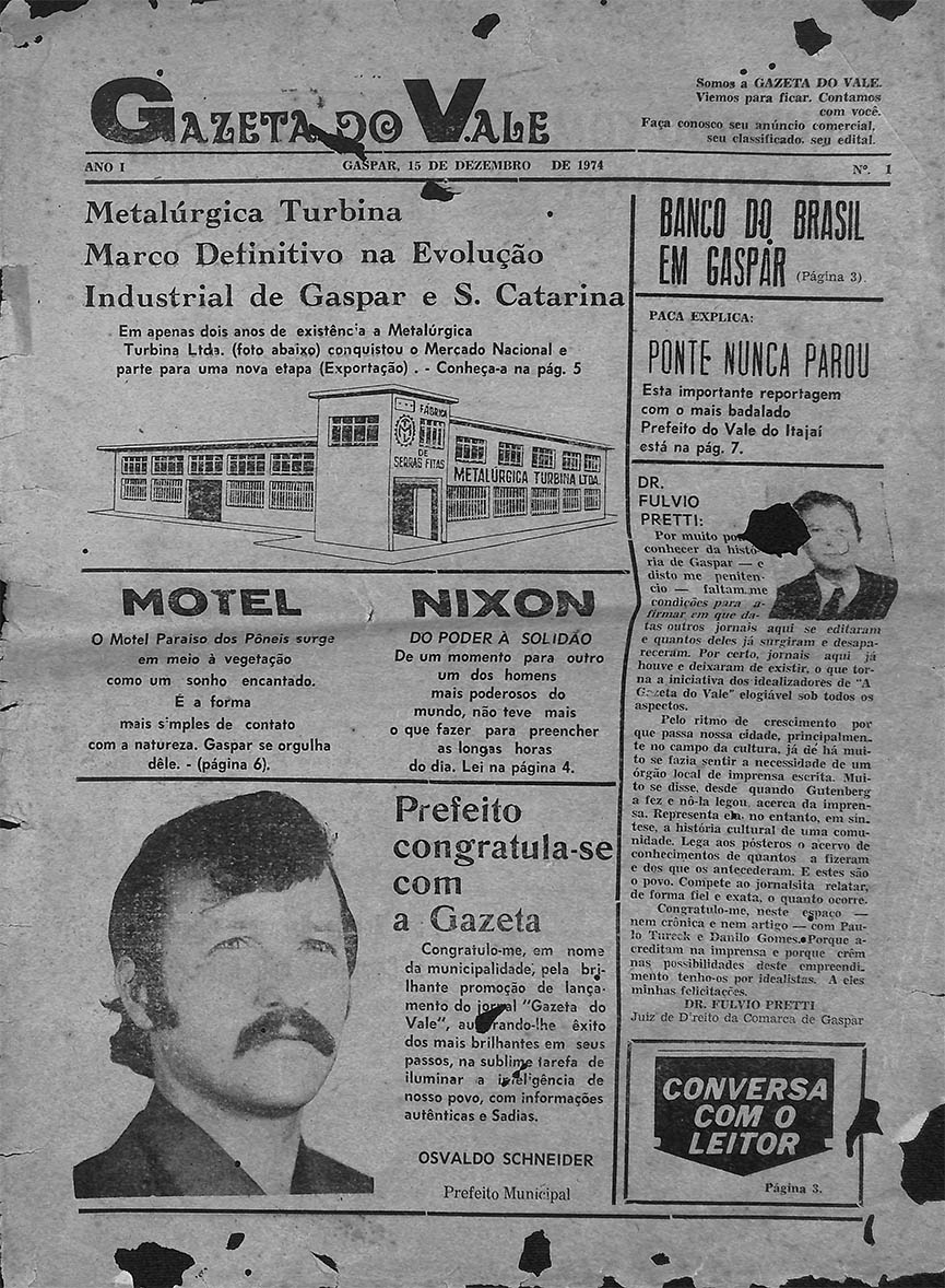 O jornal Gazeta do Vale teve início em 1974, com o jornalista gaúcho Silvio Rangel. Na época, ele era muito envolvido com o movimento político ‘Cadeia da Legalidade’ e chegou a ser preso no Rio Grande do Sul, motivo que o fez vir para Gaspar, protegido pela Igreja Católica.