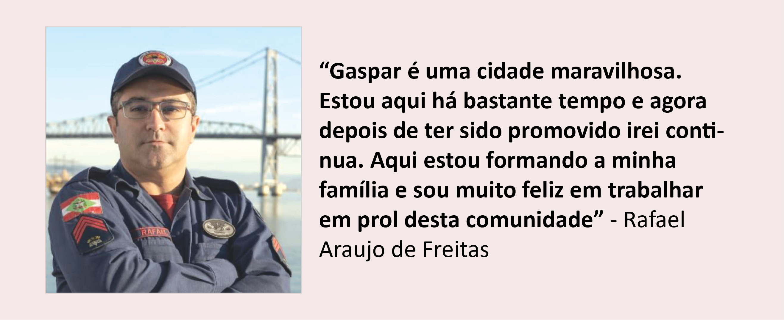 Rafael Araujo de Freitas é terceiro sargento do Corpo de Bombeiros Militar de Santa Catarina. Ele atua no estado desde 2009 e, antes disso, atuou como bombeiro no Rio Grande do Sul. Foi transferido para Gaspar em 2011 e, aqui, já atendeu diversas ocorrências. Porém, sempre que é interrogado sobre a mais marcante, ele lembra da manhã de 3 de setembro de 2011. Naquele dia, uma van escolar se envolveu em acidente com um caminhão e cinco pessoas morreram na BR-470, no trevo de acesso a Gaspar. O grupo de estudantes seguia para o Beto Carrero, em Penha, para um dia de diversão. Eles tinham entre 13 e 14 anos e eram alunos de Nova Erechim, no Oeste Catarinense. O acidente aconteceu quando um carro cortou a frente da van que, ao desviar, colidiu de frente com a carreta.