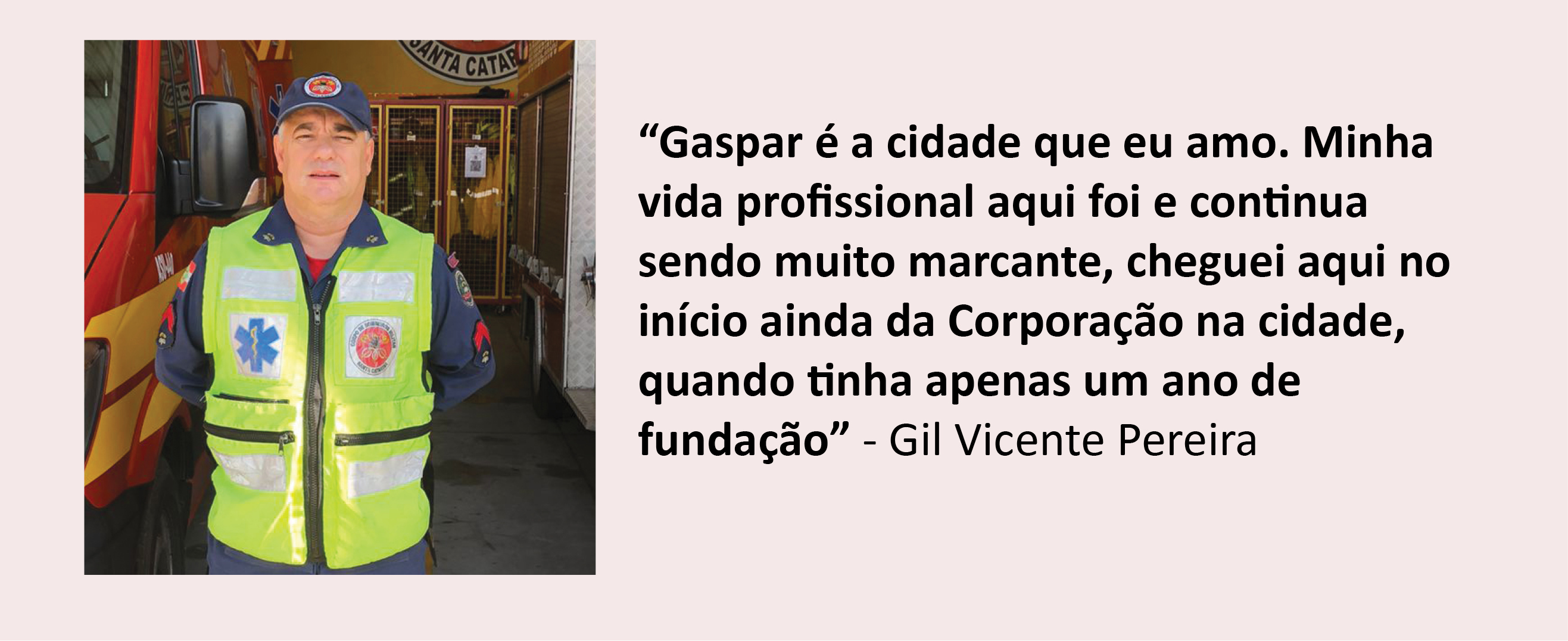 Gil Vicente Pereira é terceiro sargento da Reserva Remunerada e continua trabalhando no Corpo de Bombeiros em Gaspar. Exerce a profissão há 27 anos, sendo que 15 foram dedicados à comunidade gasparense. Entre as ocorrências mais marcantes para Gil está a enchente que aconteceu em novembro de 2008, deixou a cidade isolada e resultou em 19 mortes.
