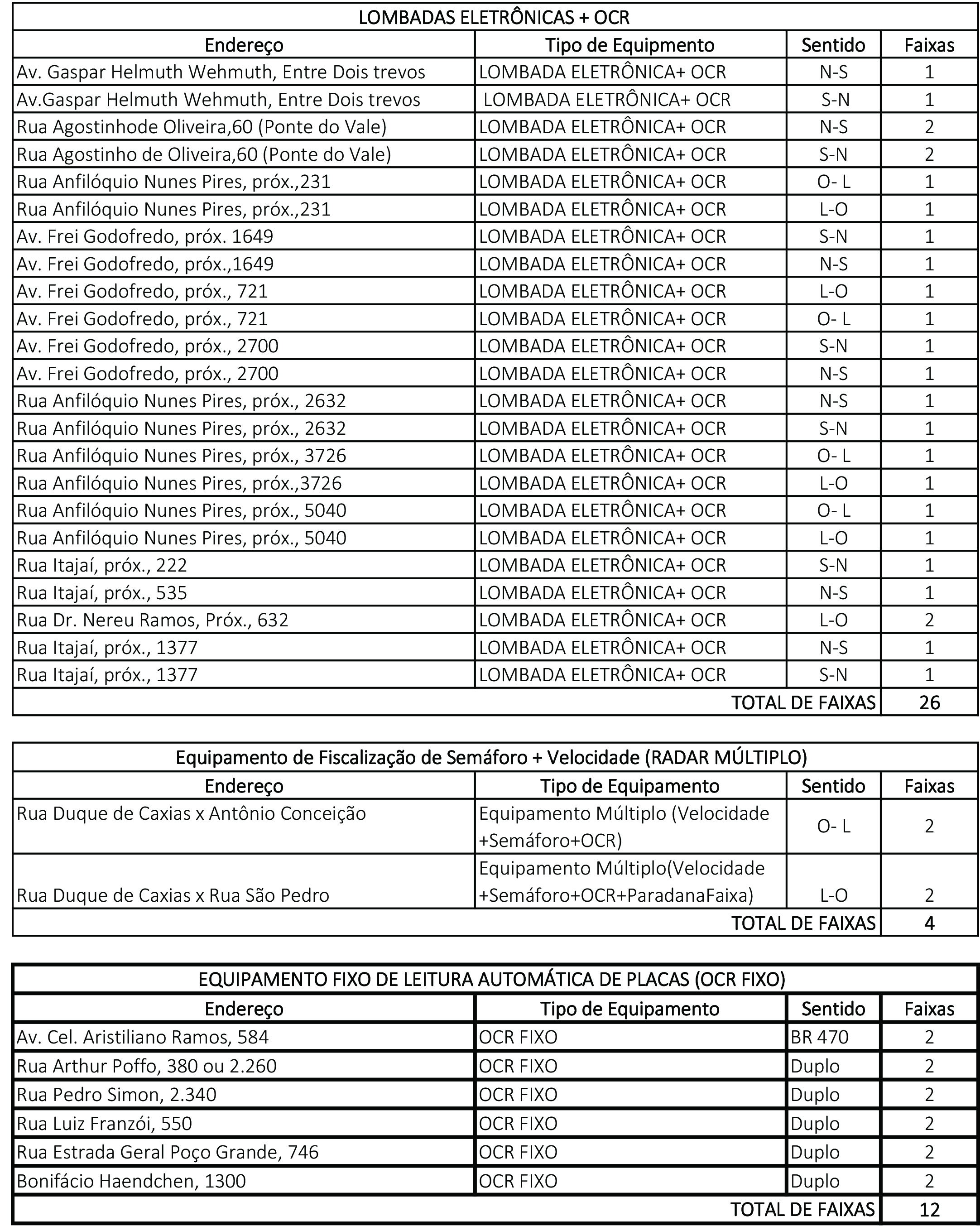 As ruas de Gaspar receberam novas lombadas eletrônicas e radares de velocidade. Apesar de estarem aparentemente funcionando normalmente, eles atuam de forma educativa a partir desta quinta-feira, dia 29 de junho, e passam a aplicar multas a partir de 15 de julho. Este período é necessário para que seja feita uma verificação por parte do Inmetro.