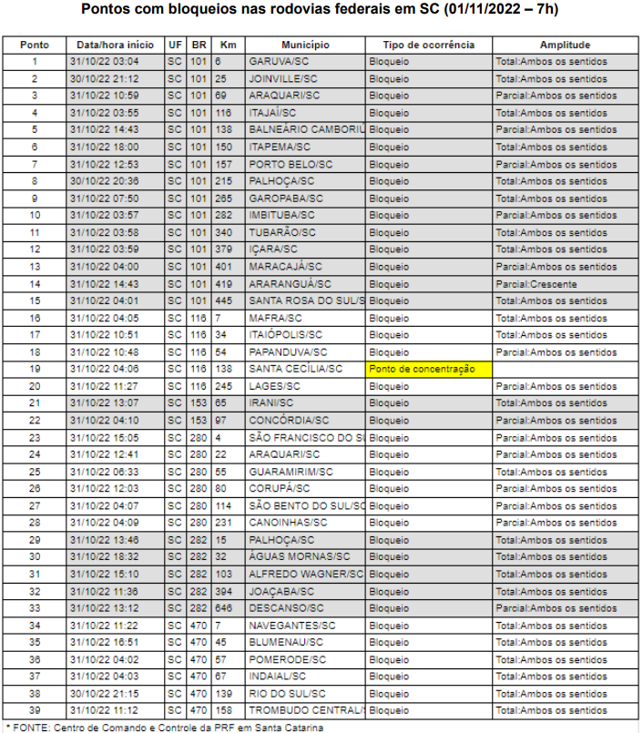 As manifestações que iniciaram na noite de domingo, dia 30 de outubro, após o resultado da eleição presidencial, seguem causando transtornos devidos aos pontos de bloqueio nas rodovias. Em Santa Catarina, as rodovias federais e estaduais somam cerca de 80 pontos de manifestações. O número foi atualizado na manhã desta terça-feira, dia 1º de novembro.
