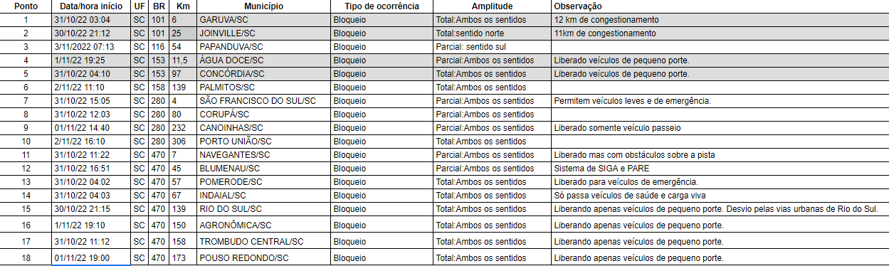 Na noite de quarta-feira, dia 2 de novembro, a Polícia Militar Rodoviária informou que não há pontos de bloqueio nas rodovias estaduais de Santa Catarina. As negociações resultaram na desobstrução de 60 pontos de bloqueio. Em nenhum dos pontos foi necessário o uso de força policial.