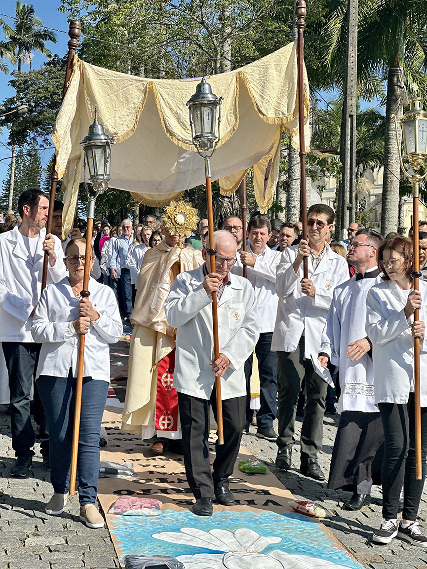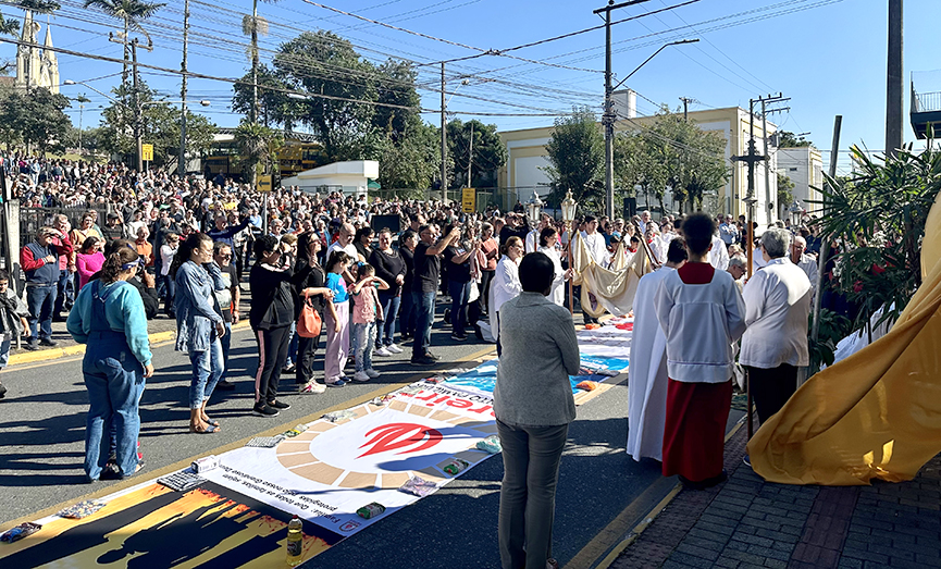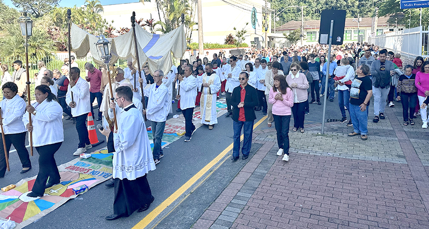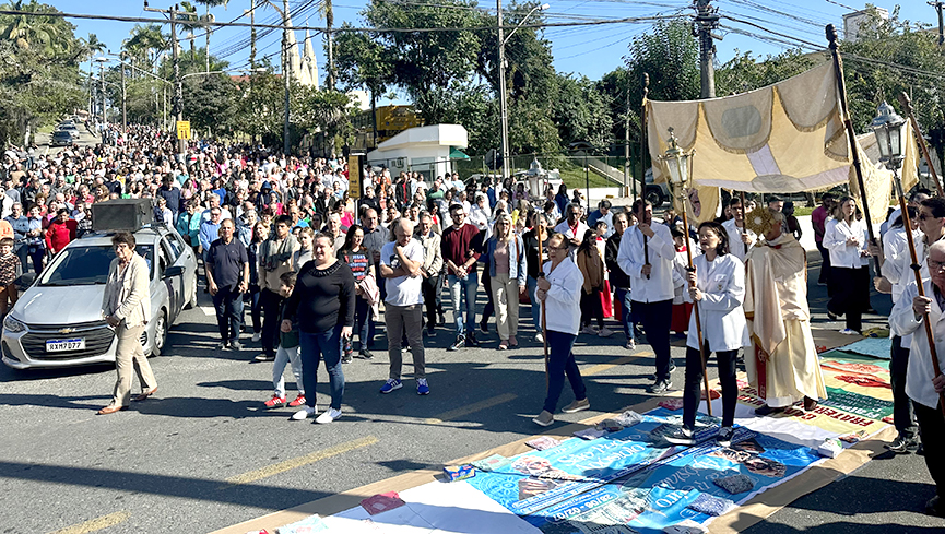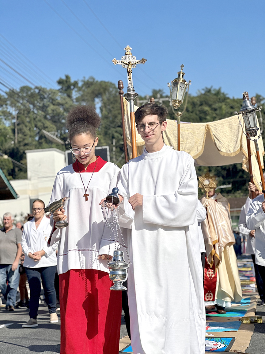 Um dos principais pontos da celebração de Corpus Christi é a confecção dos tapetes, que são montados em todo o trajeto da procissão. Cerca de 100 pessoas se empenharam na confecção e montagem, incluindo membros das comunidades, pastorais e da paróquia.