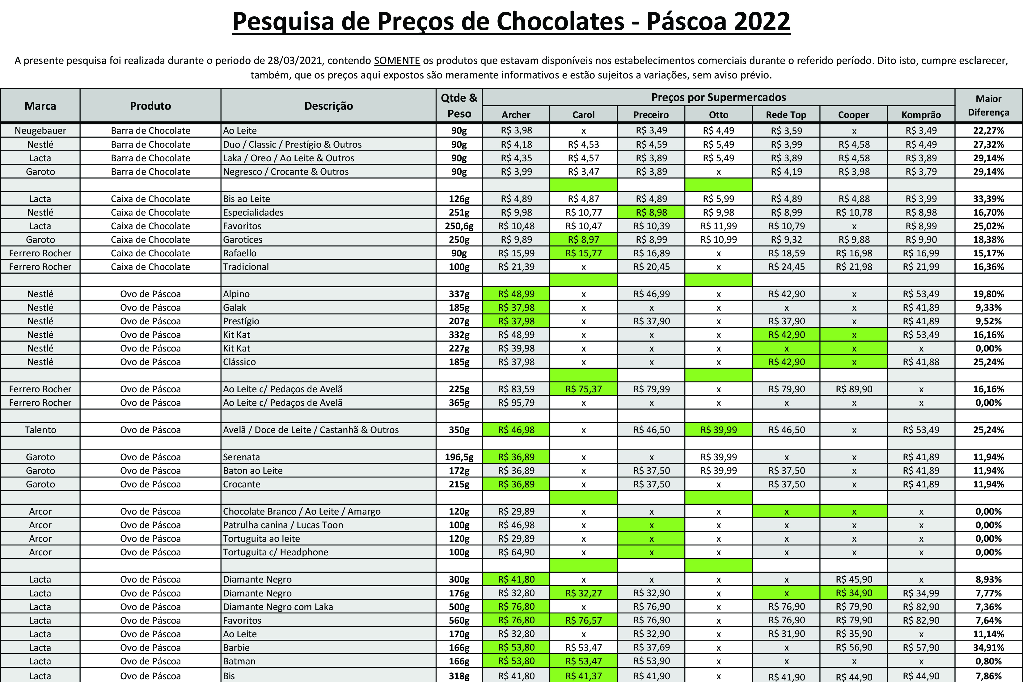 A pesquisa de preços levou em consideração as marcas, modelos e tipos de chocolates, além da gramatura e quantidades. O item que apresentou maior diferença foi o ovo de Páscoa da Barbie (166g) custando R$37,69 em um mercado e R$53,80 em outro, cerca de 35% de disparidade. O segundo item foi a caixa de Bis ao Leite (126g), podendo ser encontrada por R$3,99 e R$5,99, com uma variação de 34%.
