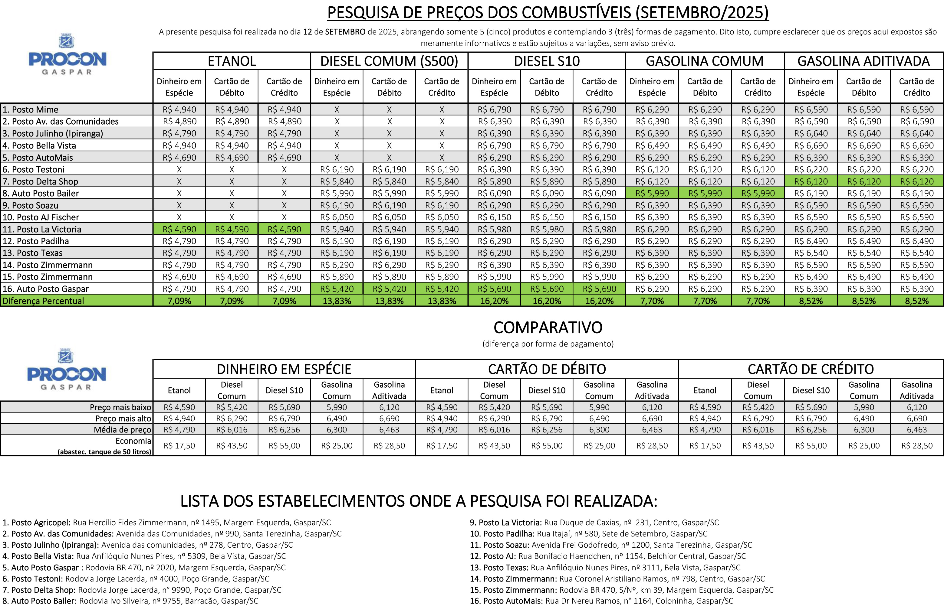 O Procon de Gaspar divulgou esta semana a pesquisa mensal de preços de combustíveis. A coleta de dados foi realizada no dia 12 de setembro, em 16 postos do município.