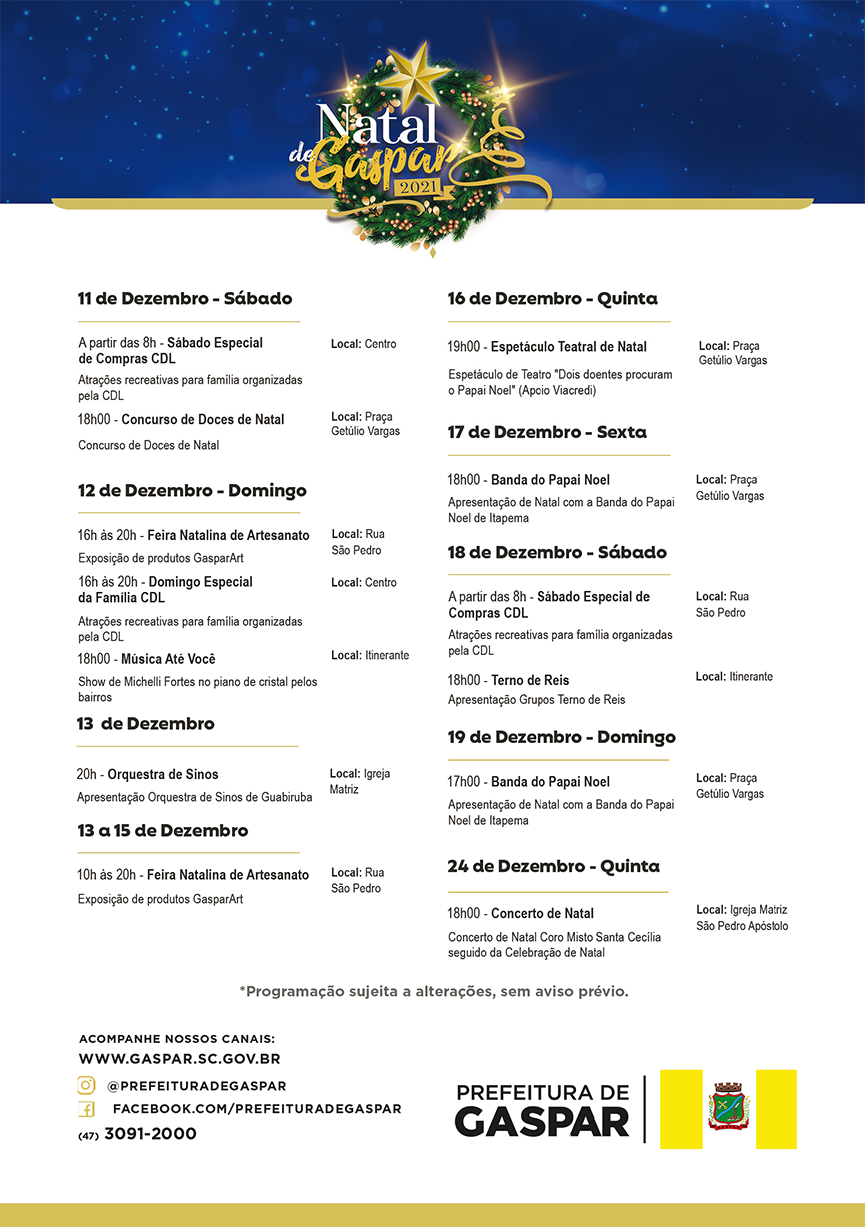 A programação do Natal de Gaspar conta com eventos e decorações especiais. Acontecerão apresentações musicais, feira de artesanato, casa do Papai Noel, celebrações religiosas e apresentações escolares. A abertura oficial do evento acontece no domingo, dia 5, às 18h, com o acendimento das luzes e show musical na Praça Getúlio Vargas.