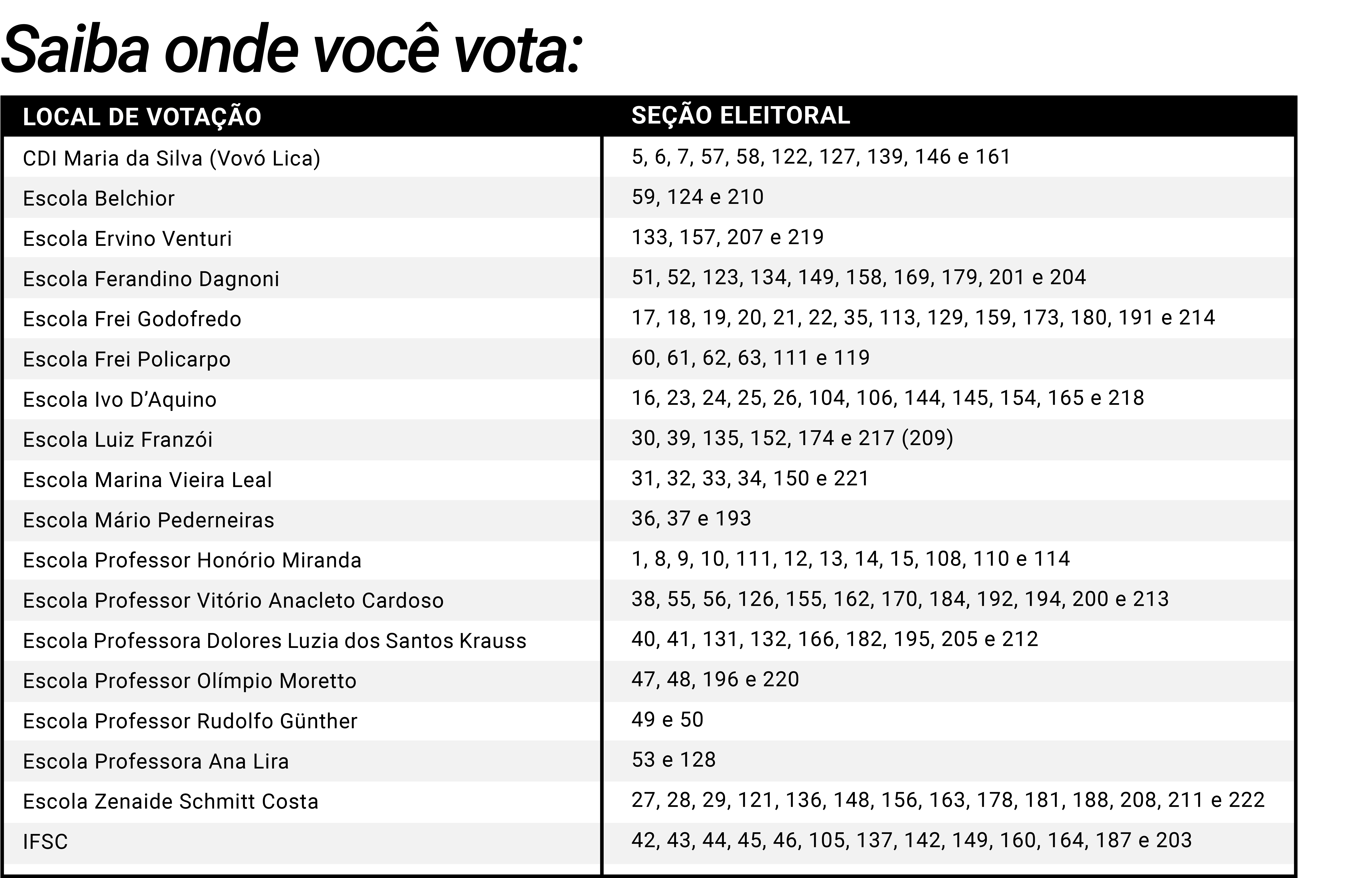 Se você ainda não conferiu seu local de votação, essa é a hora de ficar por dentro e evitar dores de cabeça no domingo, 2 de outubro. Isso porque três locais de votação foram extintos em Gaspar. Quem votava no Circolo Trentino Di Gasparin deve votar na Escola Ana Lira. Os eleitores que votavam na Comunidade Santa Clara e no Centro Comunitário Nossa Senhora Aparecida devem votar na Escola Vitório Anacleto Cardoso.