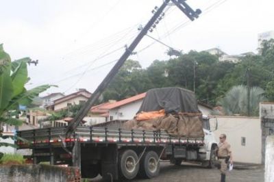Um caminhão derrubou um poste de energia elétrica na rua Canoinhas, bairro Sete de Setembro, na manhã desta terça-feira, 22. O motorista do veículo conta que ia fazer uma entrega de papel no bairro e acabou entrando na rua errada. Ao fazer a volta, não percebeu o poste a acabou batendo com a traseira do caminhão. Parte da rua ficou sem o fornecimento de energia elétrica e outra parte está com a luz em meia fase.