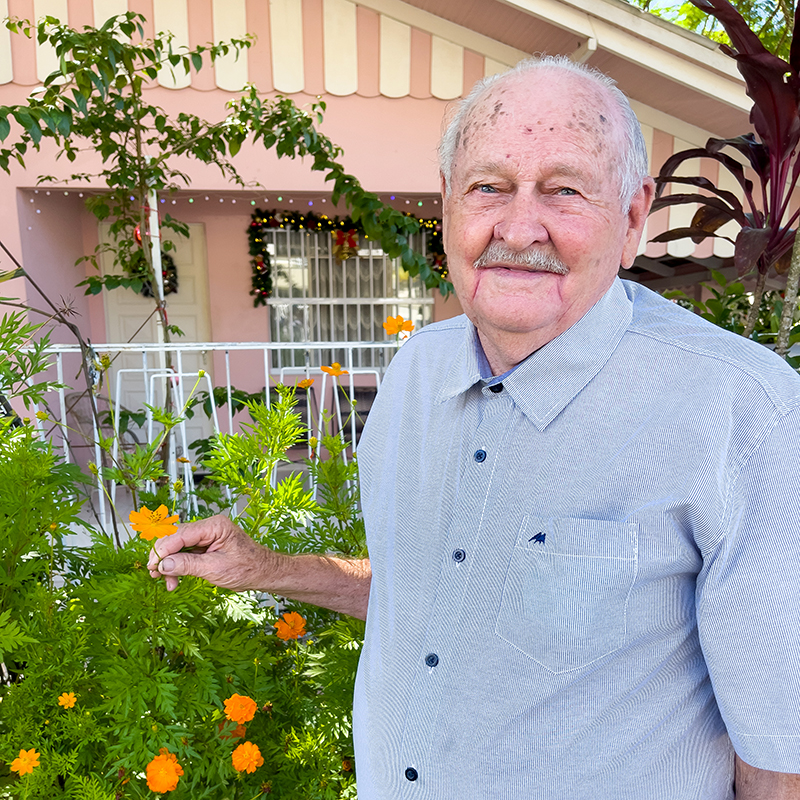 Quem passa pela rua Itajaí, no bairro Sete de Setembro, provavelmente se encanta com a casa charmosa que vivem Siegfried e Elza. Pintada de rosa e com um jardim delicado, a residência faz parte dessa linda história de amor. “Foi aqui que criamos nossos filhos, vimos nossos netos e bisnetos nascerem e hoje seguimos reunindo a família. Que benção de Deus”.