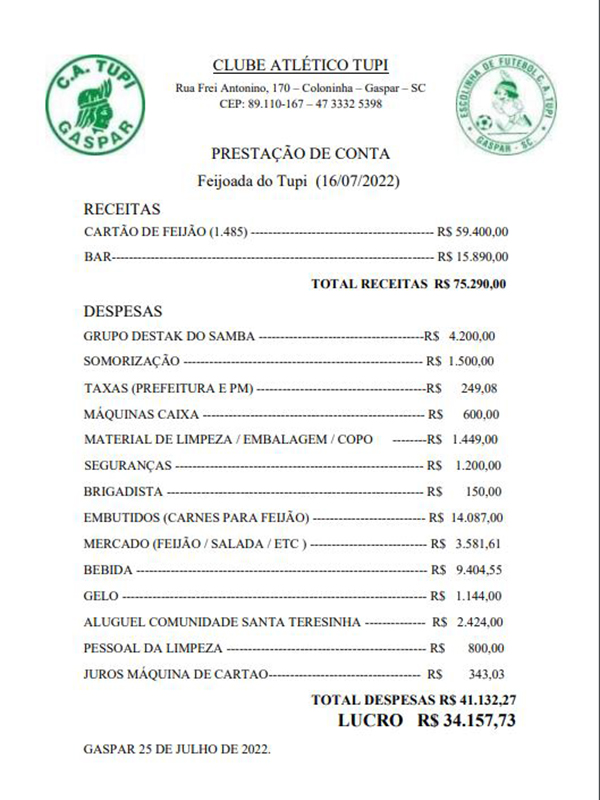 Nesta terça-feira, 26 de julho, a diretoria do Clube Atlético Tupi divulgou a prestação de contas da tradicional feijoada promovida pelo Índio Gasparense no dia 16.