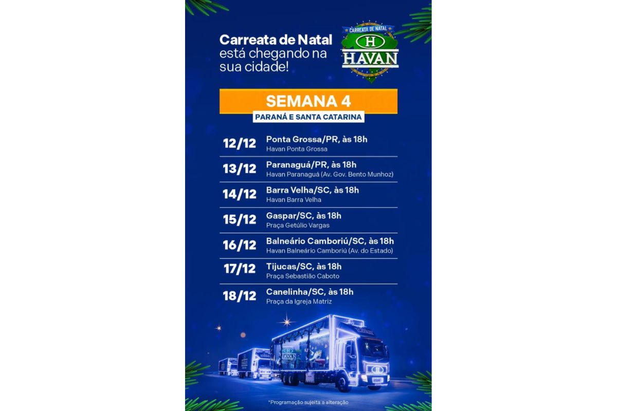 A Carreata de Natal da Havan está encantando moradores de Santa Catarina, Paraná e São Paulo desde o dia 21 de novembro e na próxima segunda-feira, dia 15 de dezembro, vai trazer um brilho ainda mais especial para Gaspar. A cidade Coração do Vale vai receber o caminhão decorado da rede de lojas por volta das 18h, na Praça Getúlio Vargas. O horário e o local foram divulgados pela Havan, mas podem sofrer alterações.