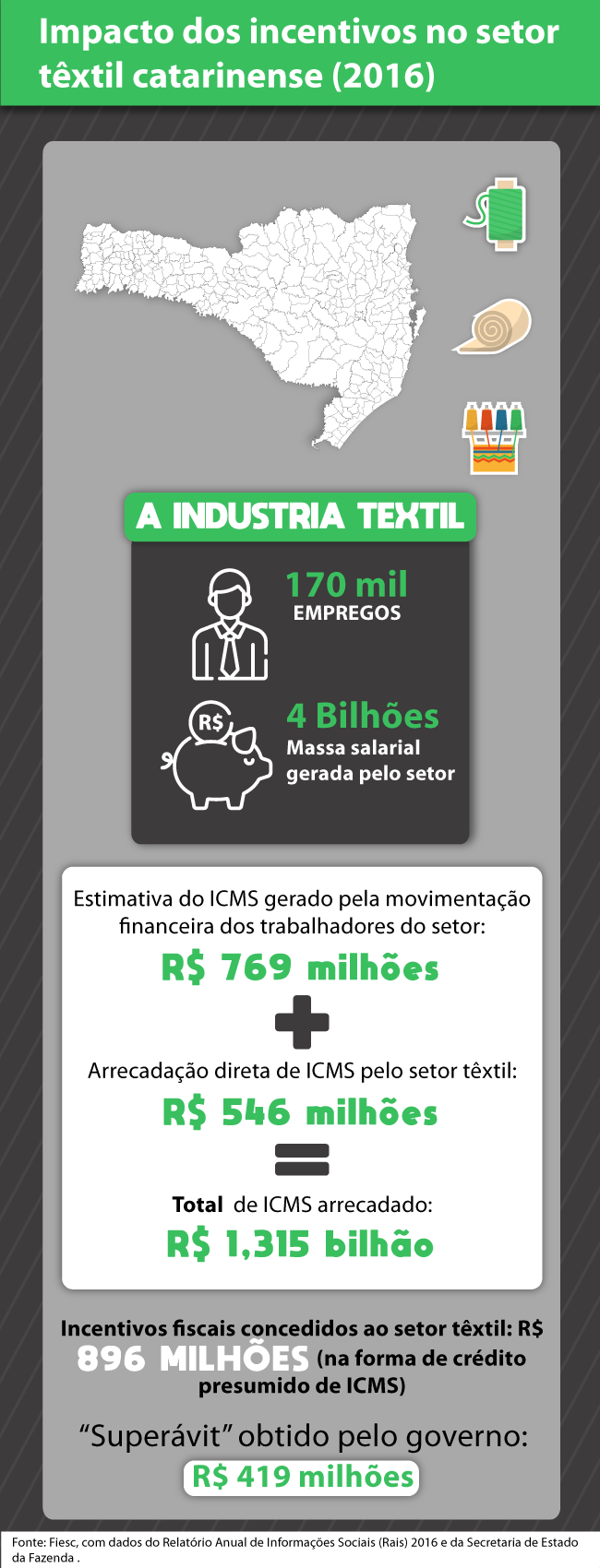 Um dos setores mais beneficiados com os incentivos em Santa Catarina é o têxtil. Por usar mão de obra de forma intensiva, é um dos que mais gera empregos no Estado, com 170 mil postos de trabalho, conforme dados da Rais 2016.