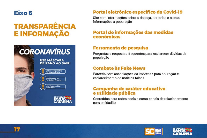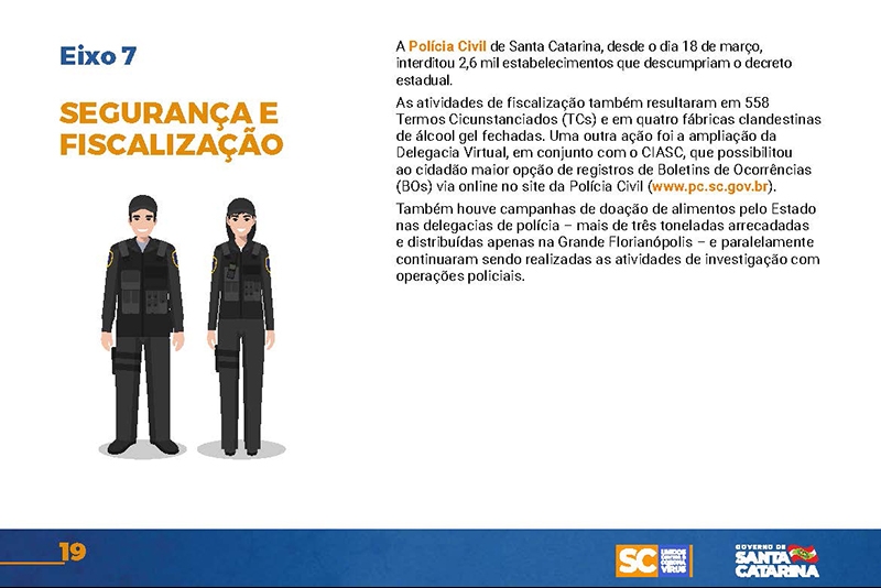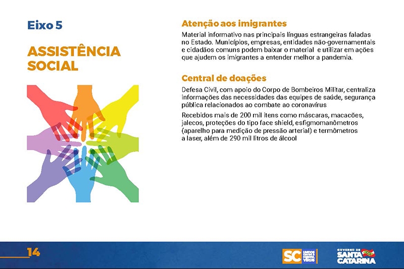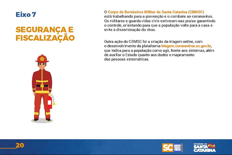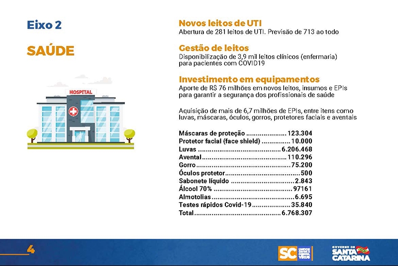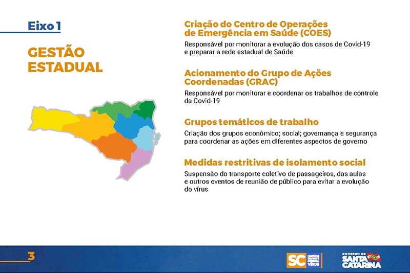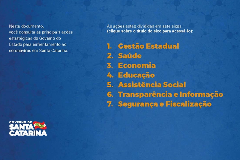 Desde então, o Executivo implementou uma série de ações nas mais diversas áreas. Um documento disponível no site www.coronavirus.sc.gov.br congrega as principais medidas, divididas por sete eixos temáticos.
