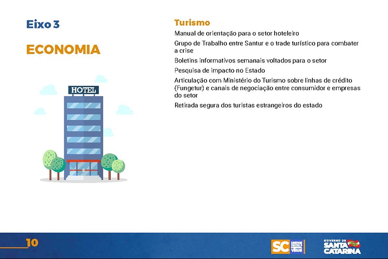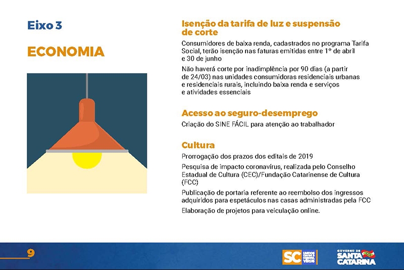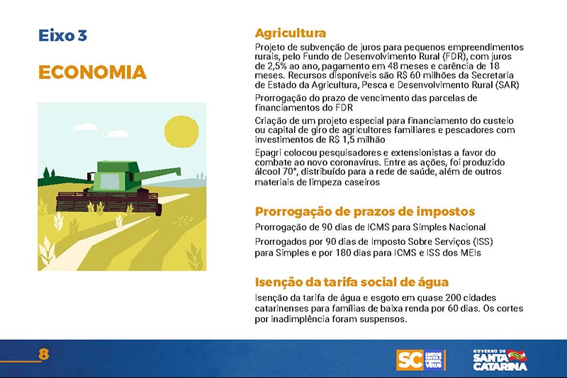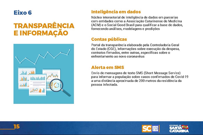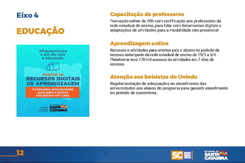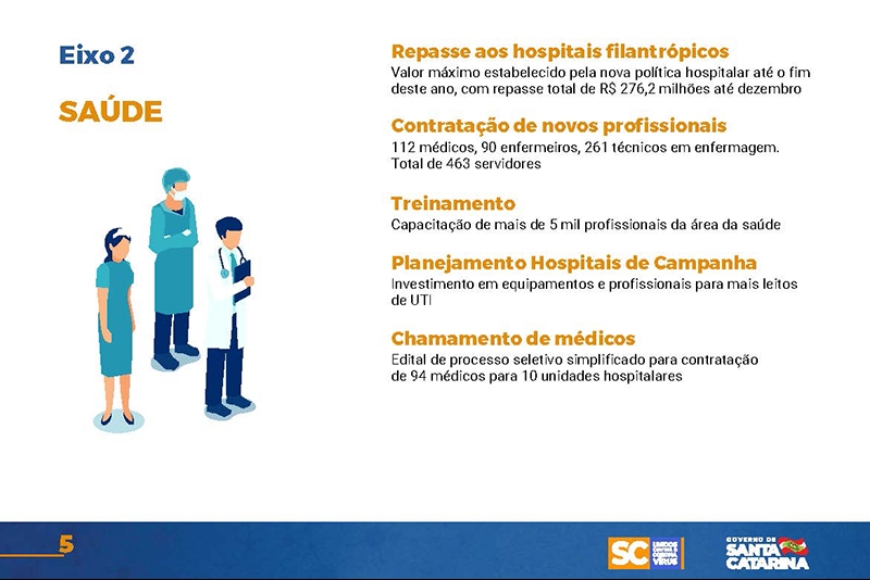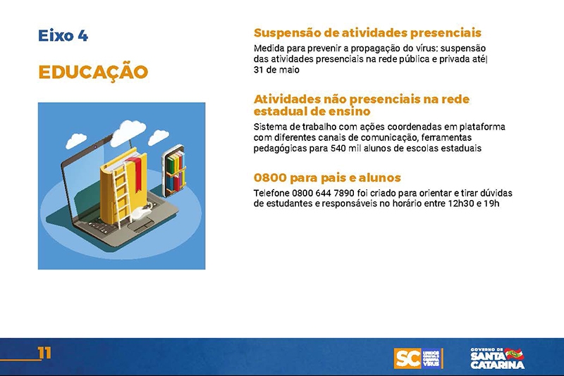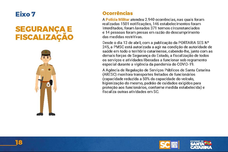 Desde então, o Executivo implementou uma série de ações nas mais diversas áreas. Um documento disponível no site www.coronavirus.sc.gov.br congrega as principais medidas, divididas por sete eixos temáticos.