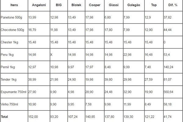 Os valores de produtos da ceia de Natal e Réveillon chegam a variar a até 560% em Blumenau, conforme pesquisa divulgada pelo Procon. O levantamento foi feito em sete supermercados na cidade do Vale do Itajaí (confira tabela abaixo).