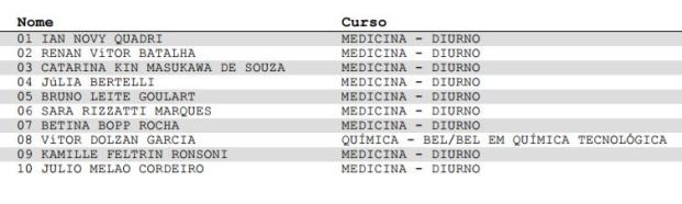 Nove dos 10 primeiros colocados passaram para medicina. O primeiro colocado geral foi Ian Novy Quadri, de Florianópolis. O oitavo colocado, Vítor Dolzan Garcia, passou para o curso de química.