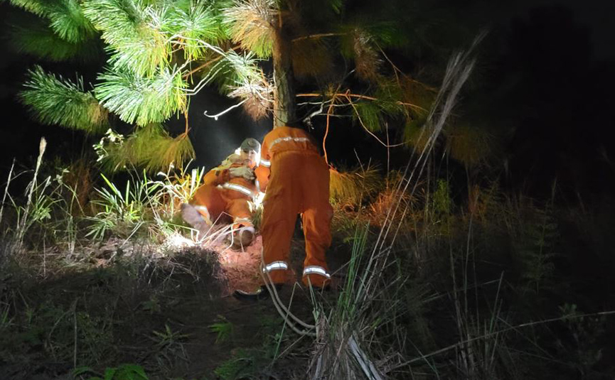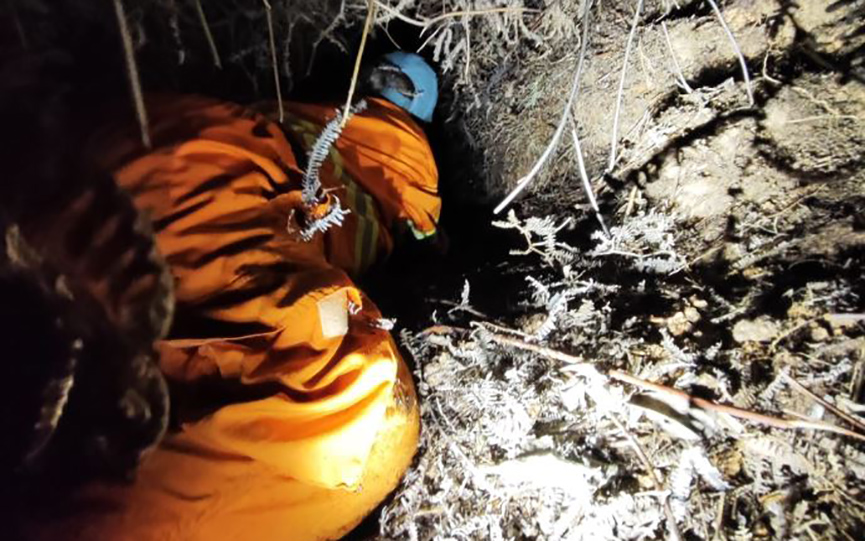 Os cães foram encontrados escondidos dentro de uma toca. Foi necessário o uso de corda para descer o barranco em segurança. Os animais foram entregues sem ferimentos ao tutor.